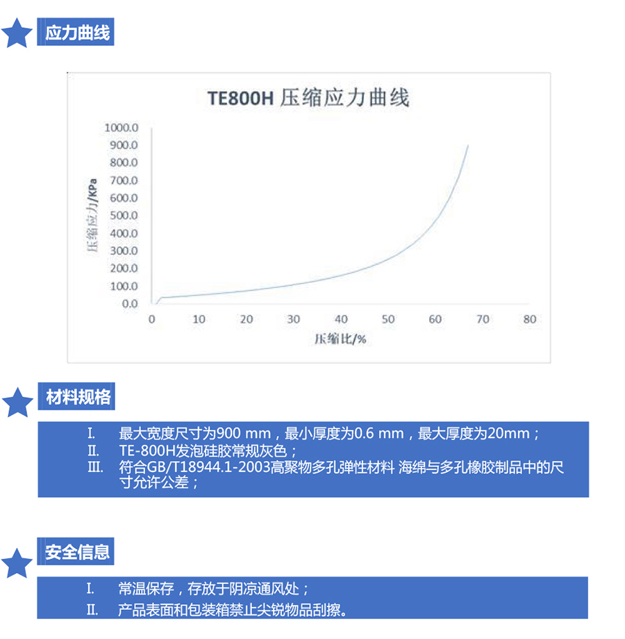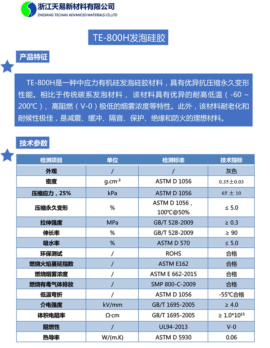 TE-800H是一種中應力有機硅發(fā)泡硅膠材料,具有優(yōu)異抗壓縮永久變形性能。相比于傳統(tǒng)碳系發(fā)泡材料,該材料具有優(yōu)異的耐高低溫( -60~200℃)、高阻燃(V-0)極低的煙霧濃度等特性。此外,該材料耐老化和耐候性極佳,是減震、緩沖、隔音、保護、絕緣和防火的理想材料。