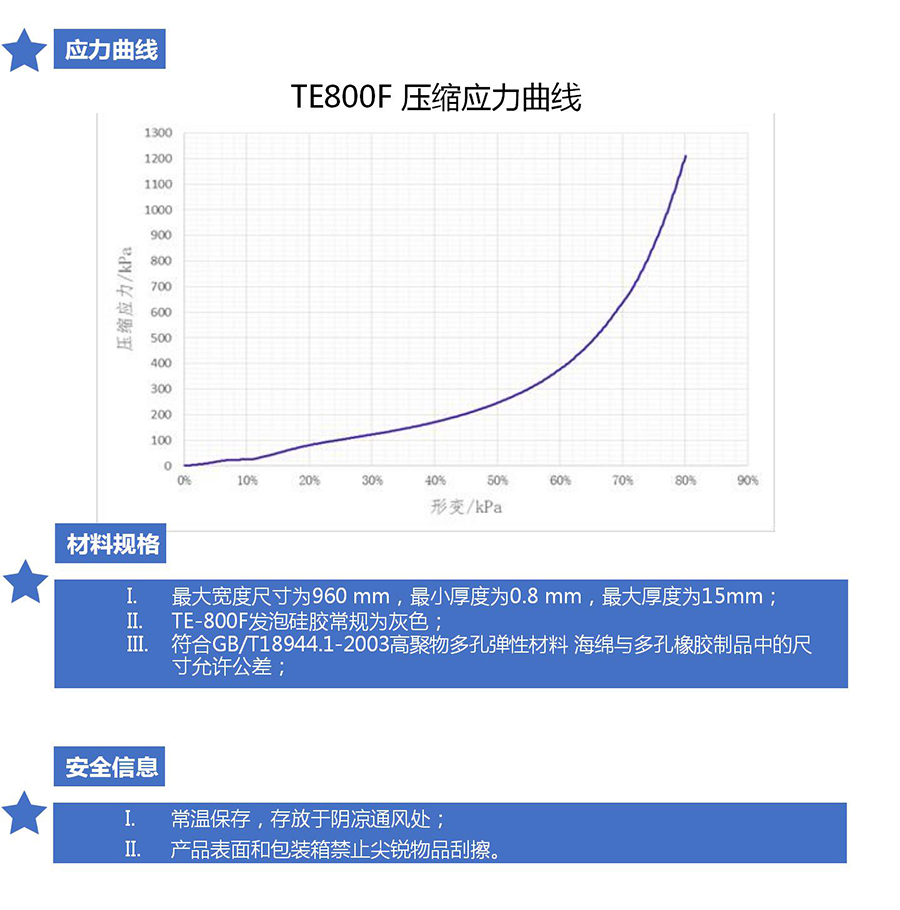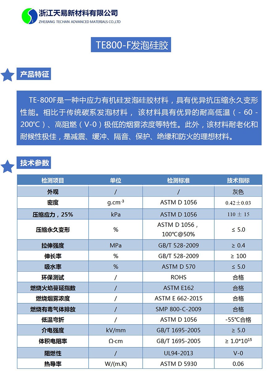 TE-800F是一種中應力有機硅發(fā)泡硅膠材料,具有優(yōu)異抗壓縮永久變形性能。相比于傳統(tǒng)碳系發(fā)泡材料, 該材料具有優(yōu)異的耐高低溫(- 60 - 200℃)、高阻燃(V-0)極低的煙霧濃度等特性。此外,該材料耐老化和耐候性極佳,是減震、緩沖、隔音、保護、絕緣和防火的理想材料。